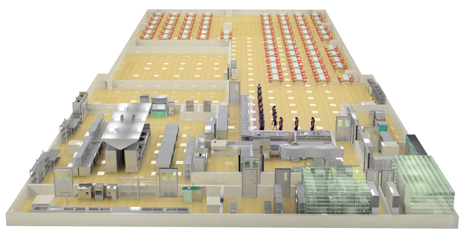 在满足工作流程通畅高效的原则下,把主食、副食、凉菜、洗消、粗加工、配餐、传菜等各种工作区域采用有形的隔断或无形的隔断分开,形成完整的工作流程,便于分工管理和食品安全管理。