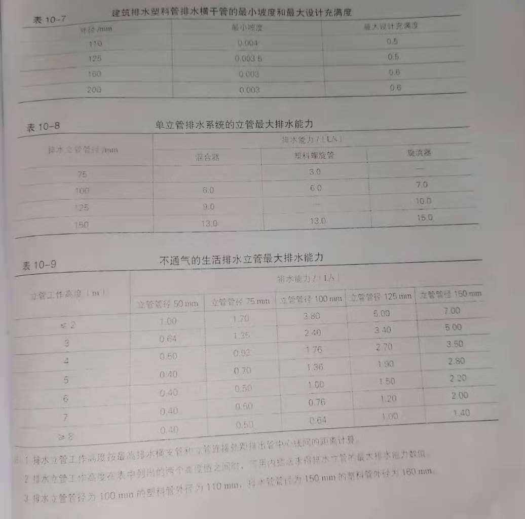 3)排水管的最小管径、最小设计和最大设计充满度