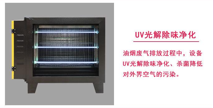 工作原理:利用UV紫外线光管发射高能C波段的光,紫外线光束改变油质的分子链,并与空气中的氧反应产生臭氧,臭氧将油烟微粒降解成微量白色粉末、水和二氧化碳.形成冷燃烧,对烟道中的异味也具有氧化消除作用。通过排风管道排出室外。这一技术易于安装,净化效率高,操作简便,维护和使用费用非常低,无二次污染,在管道和排烟罩内安装,体积小,设置艺处理得当,风阻小。由于光解反应需要运行过程,对风速、烟道长度都有具体要求、有的产品要求管道内运行长度不能低于17m,有的要求更长。紫外线光管对防潮和表面清洁有要求,还需要防止紫外线外射伤人。