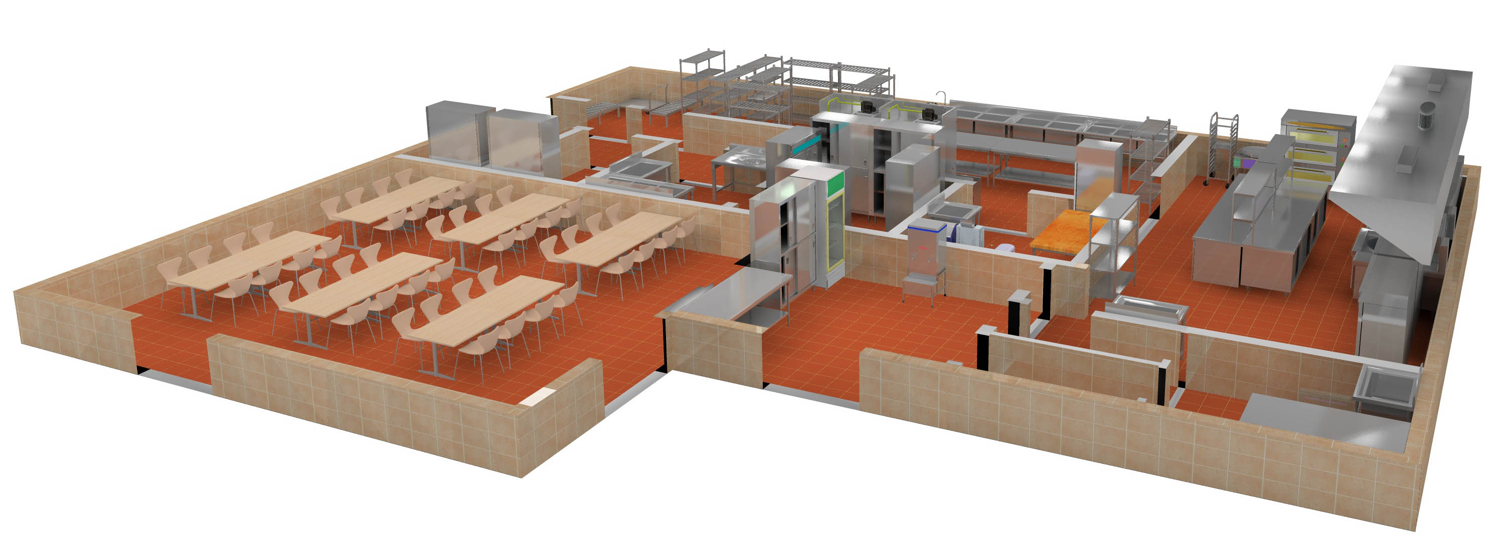 主要炒菜区为L形布局,根据需要设置打荷台与切配工作台、保证主要炒菜灶的工作需要。
