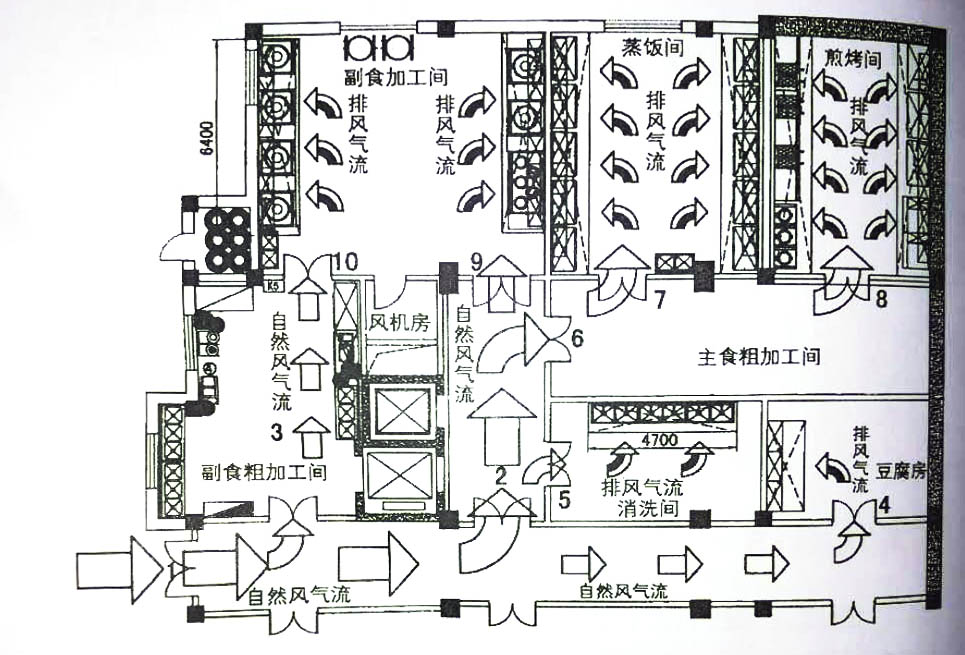 首先,图一是一个学校食堂的半地下91免费看黄片,售饭区和明档在二、三层,传菜收残全部用传菜梯,91免费看黄片有一个出入口1号门。由于不补充新风,负压太大,主食加工的蒸饭间和前烤间出入口7号、8号门关门后就很难打开,此时,下水道的污气、污水回流。